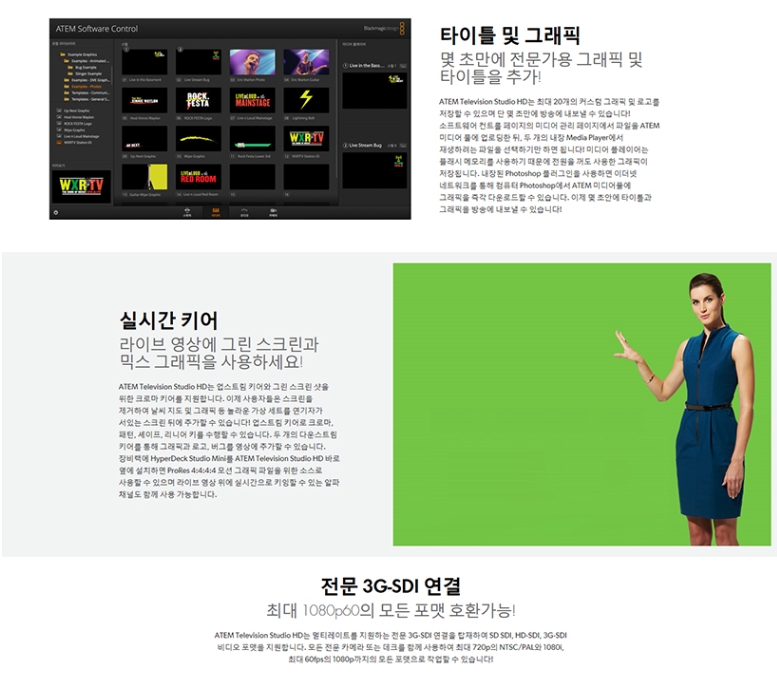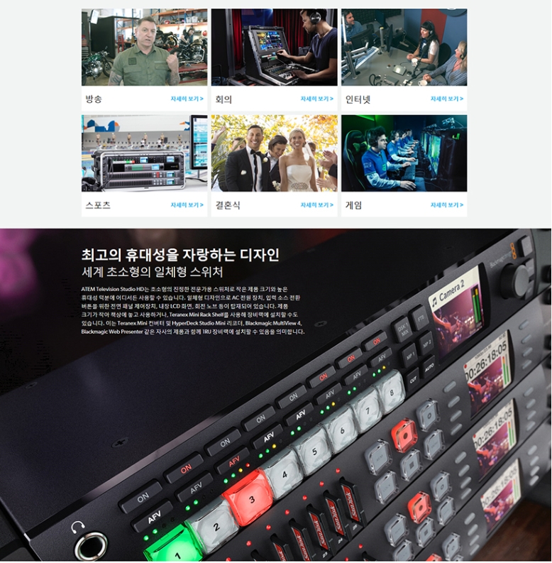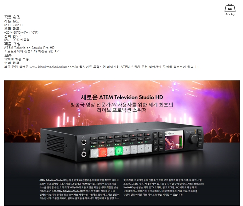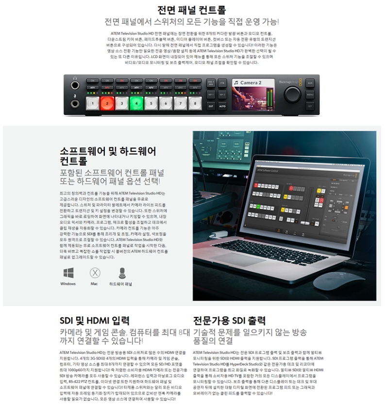 ÅëÇÕÇü Çϵå¿þ¾î Á¦¾î ÆÐ³ÎÀ» ÀåÂøÇÑ 8ä³Î ¶óÀ̺ê ÇÁ·Î´ö¼Ç ½ºÀ§Ã³Á¦Ç° °³¿äATEM Television Studio Pro HD´Â ¹æ¼Û±¹ ¹× AV Àü¹®°¡¸¦ À§ÇØ Á¦ÀÛµÈ ÃÖÃÊÀÇ »ý¹æ¼Û Á¦ÀÛ ½ºÀ§Ã³·Î ¸ðµç ±â´ÉÀ» °®Ãá Çϵå¿þ¾î ÄÁÆ®·Ñ ÆÐ³ÎÀÌ ³»ÀåµÇ¾î ÀÖ½À´Ï´Ù. ¸ðµç ÀԷ¿¡¼ À絿±âÈ ±â´ÉÀ» Áö¿øÇÏ´Â 4°³ÀÇ SDI ¹× 4°³ÀÇ HDMI ÀÔ·ÂÀ» žÀçÇØ ¹æ¼Û¿ë ¶Ç´Â ÀÏ¹Ý ¼ÒºñÀÚ¿ë Ä«¸Þ¶ó¿Í ÇÔ²² »ç¿ëÇÒ ¼ö ÀÖ½À´Ï´Ù. ÃÖ÷´Ü ±â´Éµé·Î °¡µæÂù ATEM Television Studio Pro HD´Â »ý¹æ¼Û Á¦ÀÛ ¹× TV µå¶ó¸¶, À¥ ÇÁ·Î±×·¥, AV, ºñµð¿À °ÔÀÓ ´ëȸ »ýÁß°è ÀÛ¾÷¿¡ »ç¿ëÇϱâ ÃÖÀûÀÎ Á¦Ç°ÀÔ´Ï´Ù! Ä«¸Þ¶ó ¶Ç´Â °ÔÀÓ ÄܼÖ, ÄÄÇ»ÅÍ¿¡ °£´ÜÈ÷ ¿¬°áÇϱ⸸ ÇÏ¸é ¶óÀ̺ê ÀüȯÀ» ½ÃÀÛÇÒ ¼ö ÀÖ½À´Ï´Ù!¿¬°áÃÑ ºñµð¿À ÀÔ·Â8ÃÑ Ãâ·Â8ÃÑ º¸Á¶ Ãâ·Â ¼ö1SDI ¼Óµµ270Mb, 1.5G, 3G.ÃÑ ¿Àµð¿À ÀÔ·Â ¼ö2°³ÀÇ XLR. ÃÑ ¿Àµð¿À Ãâ·Â ¼ö ¹ÌÁö¿ø(ÀÓº£µðµå ¿Àµð¿À¸¸ Áö¿ø).